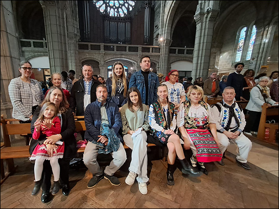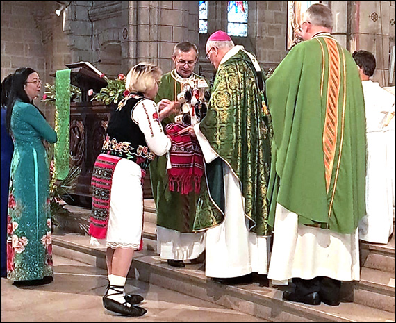 Pentru Sfânta Liturghie, fiecare comunitate a fost invitată să aducă ceva specific țării de proveniență, comunitatea românească din Libourne-Bordeaux oferind un ansamblu popular-tradițional format dintr-o oală cu ulcele și o tavă bogată cu fructe specifice, toate așezate pe cunoscutele ștergare roșii românești.