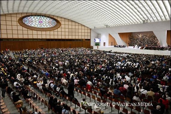 Sunt bucuros să vă întâlnesc în ziua următoare canonizării celor șapte noi sfinți, de care, din diverse motive, sunteți foarte atașați. Salut pe fiecare dintre voi, îndeosebi pe cardinalii, episcopii, superioarele călugărițe și autoritățile civile prezenți aici. Evenimentul bucuros și solemn pe care l-am celebrat ieri ne amintește că comuniunea Bisericii îi implică pe toți credincioșii, în spațiu și în timp, în fiecare limbă și cultură, unindu-ne ca popor al lui Dumnezeu, trup al lui Cristos și templu al Duhului Sfânt.