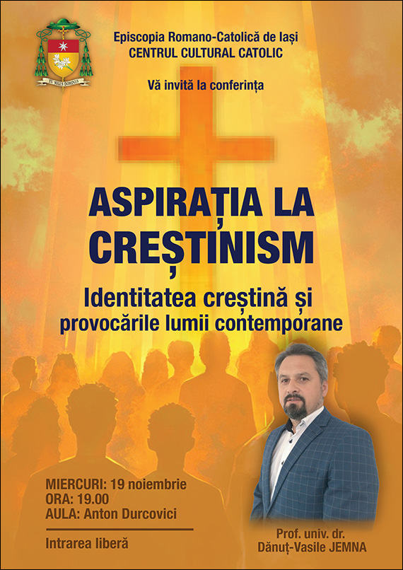 Centrul Cultural Catolic Iași organizează conferința "Aspirația la creștinism. Identitatea creștină și provocările lumii contemporane" ținută de prof. univ. dr. Dănuț-Vasile Jemna, miercuri, 19 noiembrie 2025, la ora 19.00, în Aula "Fericitul Anton Durcovici" a Catedralei "Sfânta Fecioară Maria, Regină" din Iași.