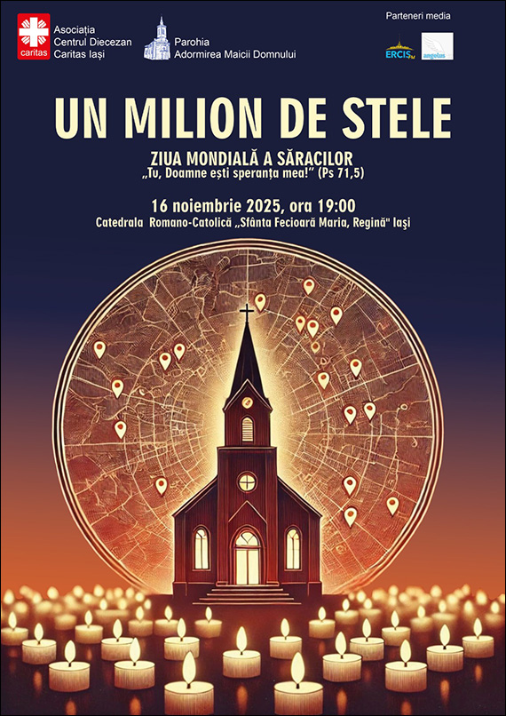 Asociația Centrul Diecezan Caritas Iași, alături de Episcopia Romano-Catolică și parohii, a mobilizat comunitatea pentru a transforma credința în fapte concrete de iubire. Duminică, 16 noiembrie 2025, la ora 19:00, la Catedrala "Sfânta Fecioară Maria, Regină" din Iași, se va desfășura evenimentul caritabil "Un milion de stele", coincizând cu Ziua Mondială a Săracilor. Acțiunea, extinsă în 79 de parohii din 9 până în 23 noiembrie, include aprinderea de lumini ca simbol al solidarității și speranței pentru cei vulnerabili. Scopul este acela de a oferi sprijin material și spiritual familiilor aflate în sărăcie, bolnavilor și vârstnicilor, răspunzând astfel îndemnului Sfântului Părinte de a privi sărăcia ca pe o întâlnire. De asemenea, la Seminarul "Sfântul Iosif" în aceeași zi va avea loc prima ediție a "Mesei Săracului", un moment al fraternității.