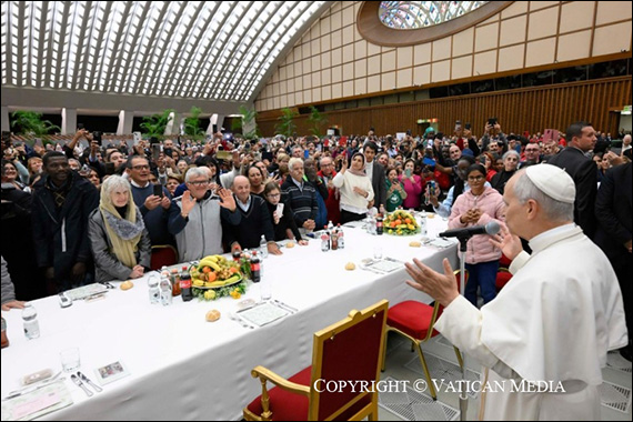 Acest prânz pe care îl primim acum este oferit de Providență și de marea generozitate a Comunității "Sfântul Vincențiu", vincențienii, cărora vrem să le mulțumim. Și este și o aniversare: 400 de ani de la nașterea fondatorului lor. Ne vor însoți, servind la masă. Cele mai bune urări vouă tuturor, preoți, călugărițe, voluntarii laici care lucrează în întreaga lume ajutând atât de mulți oameni săraci și persoane care se confruntă cu diferite necesități. Suntem cu adevărat, cu adevărat plini de acest spirit de mulțumire, de recunoștință în această zi.