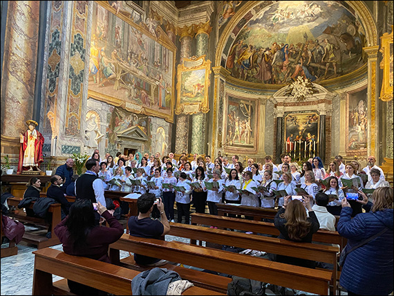 Într-o atmosferă de comuniune și bucurie, corurile s-au unit într-o singură voce, iar sub îndrumarea dirijorului Anton Babiaș, acompaniat la orgă de Daniel Nesimuca, au animat cântarea din cadrul Sfintei Liturghii de la Bazilica "San Vitale" de la ora 16:00.