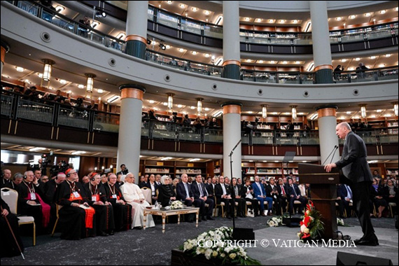 Frumusețea naturală a țării dumneavoastră ne îndeamnă să protejăm creația lui Dumnezeu. Mai mult, bogăția culturală, artistică și spirituală a locurilor în care le locuiți ne amintește că atunci când se întâlnesc diferite generații, tradiții și idei, se creează mari civilizații în care dezvoltarea și înțelepciunea sunt reunite într-o unitate. Pe de o parte, este adevărat că istoria umană are în spate secole de conflicte și că lumea din jurul nostru este încă destabilizată de ambiții și alegeri care calcă în picioare dreptatea și pacea. În același timp, atunci când ne confruntăm cu provocări, a fi un popor cu un trecut atât de mare este atât un dar, cât și o responsabilitate. Imaginea podului peste Strâmtoarea Dardanele, aleasă ca logo pentru călătoria mea, exprimă elocvent rolul special al țării dumneavoastră. Aveți un loc important atât în prezentul, cât și în viitorul Mediteranei și al întregii lumi, mai ales prin valorizarea diversității voastre interne. Chiar înainte de a lega Asia de Europa, Estul de Vest, acest pod leagă Turcia de ea însăși. El combină diferite părți ale țării, transformând-o din interior, ca să spunem așa, într-o "intersecție de sensibilități". Într-un astfel de caz, uniformitatea ar fi o sărăcire. Într-adevăr, o societate este vie dacă are o pluralitate, căci ceea ce o face o societate civilă sunt punțile care leagă oamenii săi între ei. Totuși, astăzi, comunitățile umane sunt din ce în ce mai polarizate și sfâșiate de poziții extreme care le fragmentează. Vă asigur cu bucurie că creștinii doresc să contribuie pozitiv la unitatea țării dumneavoastră. Ei fac și se simt parte din identitatea turcă, care a fost foarte apreciată de Sfântul Ioan al XXIII-lea, pe care îl amintiți ca "papa turc" pentru prietenia profundă care l-a legat întotdeauna de poporul dumneavoastră. A fost administrator al vicariatului latin de Istanbul și delegat apostolic în Turcia și Grecia din 1935 până în 1945 și a lucrat neobosit pentru ca toți catolicii să nu se excludă din dezvoltarea continuă a noii voastre republici. În acei ani, el a scris că aici, în această națiune, "noi, catolicii latini din Istanbul și catolicii de alte rituri, armeni, greci, caldeeni, sirieni etc., suntem o minoritate modestă care trăiește pe suprafața unei lumi vaste cu care avem numai un contact limitat. Ne place să ne distingem de cei care nu ne mărturisesc credința: frații noștri ortodocși, protestanți, evrei, musulmani, credincioși și necredincioși de alte religii… Pare logic ca fiecare să-și vadă de treburile sale, de tradițiile sale familiale sau naționale, păstrându-se în cercul restrâns al propriei comunități… Dragii mei frați și surori, dragii mei fii, trebuie să vă spun că, în lumina evangheliei și a principiilor catolice, aceasta este o logică falsă"[1]. De atunci, s-au făcut, fără îndoială, pași mari în cadrul Bisericii și în societatea voastră, totuși aceste cuvinte rezonează încă puternic în zilele noastre și continuă să inspire un mod de gândire mai evanghelic și mai autentic, pe care Papa Francisc l-a numit "cultura întâlnirii". Într-adevăr, din inima Mediteranei, venerabilul meu predecesor s-a opus "globalizării indiferenței", invitându-ne să simțim durerea celorlalți și să ascultăm strigătul săracilor și al pământului. Astfel, ne-a încurajat la o acțiune plină de compasiune, care este o reflectare a unicului Dumnezeu milostiv și plin de compasiune, "încet la mânie și plin de iubire neclintită" (Ps 103,8). Și în acest sens este utilă imaginea marelui vostru pod, căci Dumnezeu, revelându-se, a stabilit o punte între cer și pământ. A făcut-o pentru ca inimile noastre să se schimbe, devenind asemenea inimii sale. Este un vast pod suspendat, care sfidează aproape legile fizicii. De asemenea, pe lângă aspectele sale intime și private, și iubirea are o dimensiune vizibilă și publică. Mai mult, dreptatea și milostivirea pun la îndoială mentalitatea acelui "ceea ce este mai puternic este drept" și îndrăznesc să ceară ca să fie considerate compasiunea și solidaritatea criterii autentice de dezvoltare. Din acest motiv, într-o societate precum cea din Turcia, unde religia joacă un rol vizibil, este esențial să onorăm demnitatea și libertatea tuturor fiilor lui Dumnezeu, bărbați și femei, concetățeni și străini, săraci și bogați. Suntem cu toții fii ai lui Dumnezeu, iar acest lucru are implicații personale, sociale și politice. Cei cu inimile docile voinței lui Dumnezeu promovează întotdeauna binele comun și respectul pentru toți. Astăzi, aceasta este o mare provocare, care trebuie să remodeleze politicile locale și relațiile internaționale, mai ales în fața evoluțiilor tehnologice care altfel ar putea exacerba nedreptatea în loc să ajute la depășirea ei. Chiar și inteligența artificială reproduce pur și simplu propriile noastre preferințe și accelerează procese care, la o privire mai atentă, nu sunt opera mașinilor, ci a omenirii însăși. Să lucrăm împreună, așadar, pentru a schimba traiectoria dezvoltării și a repara daunele deja produse unității familiei noastre umane. Doamnelor și domnilor, tocmai am menționat familia umană. Această metaforă ne invită să stabilim o legătură – încă o dată, o punte – între destinul nostru comun și experiențele fiecărui individ. Într-adevăr, pentru fiecare dintre noi, familia a fost primul nucleu al vieții sociale, în care am învățat că fără "celălalt" nu există "eu". Mai mult decât în alte țări, familia păstrează o mare importanță în cultura turcă și nu lipsesc inițiativele care să susțină centralitatea sa. Într-adevăr, atitudinile esențiale pentru conviețuirea civilă, plus sensibilitatea inițială și fundament