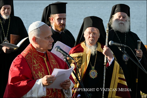 Această întrebare este deosebit de importantă pentru creștini, care riscă să-l reducă pe Isus Cristos la un fel de lider charismatic sau supraom, o denaturare care duce în cele din urmă la tristețe și confuzie (cf. Leon al XIV-lea, Omilia, Sfânta Liturghie Pro Ecclesia, 9 mai 2025). Negând divinitatea lui Cristos, Arius l-a redus la un simplu intermediar între Dumnezeu și omenire, ignorând realitatea Întrupării, astfel încât divinul și umanul au rămas iremediabil separate. Dar dacă Dumnezeu nu s-a făcut om, cum pot creaturile muritoare să participe la viața sa nemuritoare? Ceea ce a fost în joc la Niceea și este în joc și astăzi este credința noastră în Dumnezeul care, în Isus Cristos, s-a făcut asemenea nouă pentru a ne face "părtași de natura divină" (2Pt 1,4; cf. Sfântul Irineu, Adversus Haereses, 3, 19; Sfântul Atanasiu, De Incarnatione, 54, 3). Această mărturisire cristologică de credință este de o importanță fundamentală în drumul pe care creștinii îl parcurg spre deplina comuniune. Căci este împărtășită de toate Bisericile și Comunitățile creștine din întreaga lume, inclusiv de cele care, din diferite motive, nu folosesc Crezul niceeano-constantinopolitan în liturgiile lor. Într-adevăr, credința "într-unul Domn Isus Cristos, Fiul Unicul Născut al lui Dumnezeu, născut din Tatăl mai înainte de toți vecii... de o ființă cu Tatăl" (Crezul niceeano-constantinopolitan) este o legătură profundă care deja îi unește pe toți creștinii. În acest sens, pentru a-l cita pe Sfântul Augustin, în contextul ecumenic putem spune și că "deși noi, creștinii, suntem mulți, într-unul Cristos suntem una" (Expunere la Psalmul 127). Prin urmare, conștienți că suntem deja uniți printr-o legătură atât de profundă, putem continua drumul nostru de aderare tot mai profundă la cuvântul lui Dumnezeu revelat în Isus Cristos, sub călăuzirea Duhului Sfânt, în iubire și dialog reciproc. În acest fel, suntem cu toții invitați să depășim scandalul diviziunilor care, din păcate, încă există și să cultivăm dorința de unitate pentru care Domnul Isus s-a rugat și și-a dat viața. Cu cât suntem mai împăcați, cu atât noi, creștinii, putem da o mărturie credibilă despre evanghelia lui Isus Cristos, care este o proclamație de speranță pentru toți. Mai mult, este un mesaj de pace și fraternitate universală care transcende granițele comunităților și națiunilor noastre (cf. Francisc, Discurs adresat participanților la Sesiunea Plenară a Consiliului Pontifical pentru Promovarea Unității Creștinilor, 6 mai 2022). Astăzi, întreaga omenire afectată de violență și conflicte tânjește după reconciliere. Dorința de deplină comuniune între toți cei care cred în Isus Cristos este întotdeauna însoțită de căutarea fraternității între toți oamenii. În Crezul de la Niceea, ne mărturisim credința "într-unul Dumnezeu, Tatăl". Totuși, nu ar fi posibil să-l invocăm pe Dumnezeu ca Tată dacă am refuza să-i recunoaștem ca frați și surori pe toți ceilalți bărbați și femei, care sunt creați după chipul lui Dumnezeu (cf. Conciliul Ecumenic al II-lea din Vatican, Declarația Nostra Aetate, 5). Există o fraternitate universală a bărbaților și femeilor, indiferent de etnie, naționalitate, religie sau perspective personale. Religiile, prin însăși natura lor, sunt depozitare ale acestui adevăr și ar trebui să încurajeze indivizii, grupurile și popoarele să recunoască acest lucru și să-l pună în practică (cf. Leon al XIV-lea, Discurs la încheierea Întâlnirii de Rugăciune pentru Pace, 28 octombrie 2025). În plus, trebuie să respingem cu tărie utilizarea religiei pentru justificarea războiului, a violenței sau a oricărei forme de fundamentalism sau fanatism. În schimb, căile de urmat sunt cele ale întâlnirii fraterne, ale dialogului și ale cooperării. Sunt profund recunoscător Sanctității Sale Bartolomeu, pentru că a decis cu mare înțelepciune și previziune să comemoreze împreună cea de-a 1700-a aniversare a Conciliului din Niceea chiar în locul în care s-a ținut. De asemenea, le mulțumesc călduros conducătorilor Bisericilor și reprezentanților Comuniunilor Creștine Mondiale care au acceptat invitația de a participa la acest eveniment. Fie ca Dumnezeu Tatăl, atotputernic și milostiv, să asculte rugăciunile fierbinți pe care i le înălțăm astăzi și să ne facă așa încât această aniversare importantă să aducă roade îmbelșugate de reconciliere, unitate și pace. LEO PP. XIV Traducere de pr. Mihai Pătrașcu