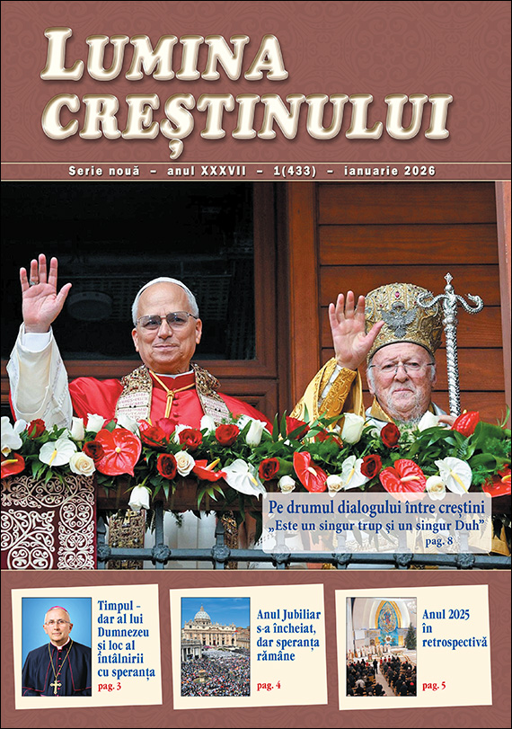 Imaginea grăitoare a întâlnirii istorice de la Istanbul dintre Papa Leon al XIV-lea și Patriarhul Bartolomeu I este ceea ce ne întâmpină vizual la primul contact cu revista "Lumina creștinului" pe luna ianuarie 2026, numărul 1 (433) al anului XXXVII. Acest număr ajunge la cititori cu întârziere din pricina zilelor libere din preajma Crăciunului, continuând cu cele de sfârșit și, respectiv, început de an și până la Bobotează, care au influențat atât activitatea redacției, cât și cea a tipografiei. O casetă constantă la pagina 2 a fiecărui număr este "Mesaj terezian", care ne oferă o meditație profundă a Sfintei Tereza a Pruncului Isus. În acest număr ea scrie despre setea de iubire a lui Isus. "Timpul - dar al lui Dumnezeu și loc al întâlnirii cu speranța", este titlul de la pagina 3 unde Preasfințitul Iosif Păuleț subliniază valoarea sacră a timpului ca spațiu de mântuire și rolul central al Euharistiei în hrănirea speranței noastre pe parcursul noului an pastoral. La rubrica "Actualitatea", la pagina 4, părintele Adrian Blăjuță analizează semnificația încheierii Anului Jubiliar 2025, amintindu-ne că, deși porțile sfinte s-au închis, poarta milostivirii rămâne mereu deschisă. În continuarea aceleiași rubrici, părintele Cristian Diac realizează la pagina 5 o retrospectivă a evenimentelor majore care au marcat Biserica în anul precedent. Tot la "Actualitatea", descoperim la paginile 6 și 7 un interviu realizat de părintele Claudiu Bulai cu părintele Fernando Manni, preot călugăr din Congregația "Fiii Iubirii Milostive", la împlinirea a două decenii de slujire a sa și a congregației din care face parte în Dieceza de Iași, venind de la Collevalenza, din Italia. Drumul spre unitate prin dialogul între creștini este abordat la pagina 8 de părintele Iosif Antili, care ne pregătește sufletește pentru Octava de Rugăciune pentru Unitatea Creștinilor. La rubrica "Părtași la viața Bisericii", Vlad Ropotică propune la pagina 9 o reflecție profundă despre echilibrul psihic și spiritual sub titlul "Viața în roz și lumea albastră". Importanța hrănirii prin rugăciune cu însuși cuvântul lui Dumnezeu este evidențiată la pagina 10 de părintele Iosif Iacob. Părintele Cătălin Farcaș analizează învierea lui Cristos ca fiind centrul vital al existenței oricărui credincios, la rubrica "Citind Scriptura", pagina 11. Viața și virtuțile părintelui Salvador Valera Parra, care va fi curând beatificat, ne sunt prezentate la pagina 12 de sora Cristiana Coșa, OSB, la rubrica "Mesajul sfinților". La pagină dedicată sanctuarelor, părintele Iosif Dorcu ne poartă virtual la pagina 13 spre maiestuoasa bazilică din Guelph, Canada. Grija pentru cei vârstnici este ilustrată la pagina 14, "În sprijinul semenilor", de părintele Anton Galațanu, care descrie activitatea Centrului "Sfântul Carol Borromeu" din Gioseni ca pe un popas al demnității și al îngrijirii creștine. Pagina familiilor, a 15-a a revistei, găzduiește o mărturie despre puterea de a o lua mereu de la capăt, prelucrată de părintele Felician Tiba. Pentru cei mici, același autor explică la pagina 16 dogma Mariei ca Născătoare de Dumnezeu, oferind un model de credință accesibil copiilor. Tinerii sunt încurajați la pagina 17 de părintele Leonard Farcaș să vadă în Isus poarta vie care nu se închide niciodată. Tot pentru tineri, părintele Petru-Sebastian Tamaș oferă la pagina 18 sfaturi pedagogice despre dialogul necesar atunci când copiii se îndepărtează de Biserică. Părintele Ioan Balan scrie la pagina 19 despre darul uimirii în fața vieții, în timp ce părintele Florin-Petru Sescu ne îndeamnă la unitate în misiune la pagina 20. Figura ilustră a Papei Leon al IX-lea este evocată la pagina 21 de părintele Petru Ciobanu. Secțiunea informativă a revistei continuă în următoarele trei pagini, 22-24, cu rubrica "Știri", îngrijită de Ovidiu Bișog, care în limitele spațiului disponibil aduc în atenție o selecție de evenimente din afara și din interiorul Diecezei de Iași. La pagina 23 găsim caseta "Din agenda episcopului Iosif Păuleț", cu o retrospectivă a vizitelor și întâlnirilor sale pastorale din luna ianuarie. În aceeași pagină, știrea intitulată constant "Slujiți Domnului cu bucurie" prezintă lună de lună momente din prezența activă a episcopului auxiliar Petru Sescu în mijlocul credincioșilor diecezei. Pe două coloane din pagina 24, sub titlul "Au trecut la Domnul", sunt pomenite două surori care și-au încheiat călătoria pământească. Dr. Bianca Hanganu oferă la pagina 25 informații medicale prețioase despre tulburările de alimentație în cadrul rubricii "În apărarea sănătății". Pagina 26 a revistei completează experiența lecturii prin rubrica "Noutăți editoriale", unde cititorii sunt invitați să descopere cele mai recente titluri propuse de Librăria "Presa Bună", având totodată posibilitatea de a-și pune în valoare talentul creativ prin participarea la concursul "Scrii și câștigi". Pentru un popas de destindere intelectuală, părintele Emanuel Imbrea propune la pagina 27 al 61-lea rebus în care cititorii sunt provocați să descopere nume și locuri biblice. Ultima copertă a revistei, care este și pagina 28, ne oferă o adaptare a unei rugăciuni după Sfântul Grigore de Narek care ne îndeamnă să privim cu încredere spre Cristos, Lumina lumii, cerând călăuzirea sa divină pentru noul an. Vă invităm să parcurgeți cu inima deschisă acest nou număr al revistei, lăsându-vă călăuziți de lumina speranței care străbate fiecare pagină. Fie ca lecturarea acestor pagini să vă fie un sprijin spiritual în noul an, ajutându-vă să descoperiți în fiecare zi prezența iubitoare a lui Dumnezeu și să deveniți, la rândul vostru, mărturisitori ai bucuriei euharistice în comunitățile din care faceți p