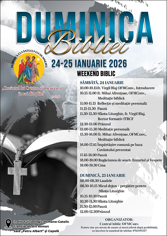 Centrul Biblic OFMConv., din cadrul Institutului Teologic Franciscan din Roman, organizează o zi de pregătire pentru Duminica Bibliei 2026. Programul va începe sâmbătă, 24 ianuarie 2026, începând cu ora 10.00, și se va încheia duminică, 25 ianuarie 2026 - Duminica Bibliei.