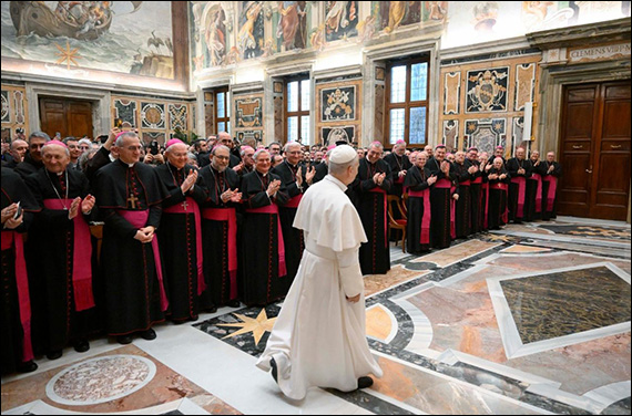 Vă mulțumesc, preaiubiților, pentru angajarea voastră, pentru slujirea voastră generoasă, pentru răbdarea și munca asiduă cu care construiți acest mozaic de unitate și de comuniune: aceasta ne ajută să locuim în lume între fidelitate și creativitate, tradiție și noutate, unitate și diversitate, mereu atenți la ceea ce, și astăzi, Duhul Domnului vrea să spună Bisericii.