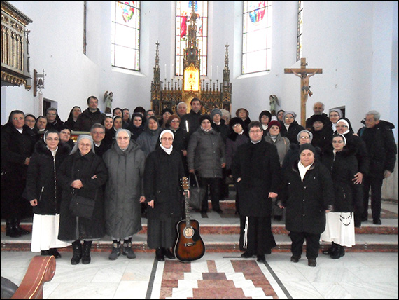 Ajunși la sanctuarul marian, într-o atmosferă de poveste, cu zăpada albă abia căzută, ne-am îndreptat spre altarul bisericii, cu cântări în cinstea Sfintei Fecioare, Regina Apostolilor și Mama noastră a tuturor. Cei care au dorit au avut posibilitatea de a se spovedii și după o scurtă prezentare a bisericii, am celebrat sfânta Liturghie, la începutul căreia părintele Anton Mărăndescu, paroh și rector al sanctuarului, ne-a salutat și ne-a urat un cuvânt de bun venit, precum și un îndemn de a fi în continuare prin prezența noastră "semne de comuniune și de bucurie pentru lumea de astăzi".