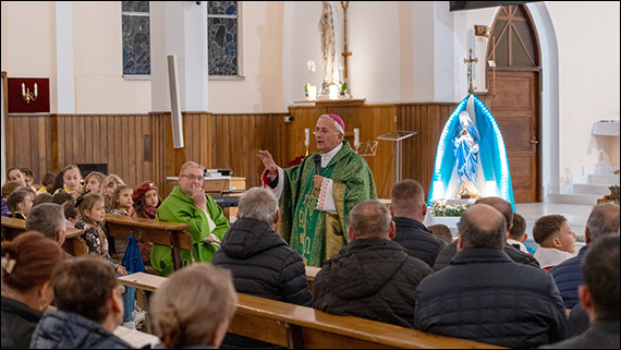 După Sfântul Rozariu, Preasfințitul a prezidat Sfânta Liturghie de deschidere a vizitei pastorale, în prezența întregii comunități: adulți, copii, tineri și bătrâni, uniți în jurul păstorului diecezei.