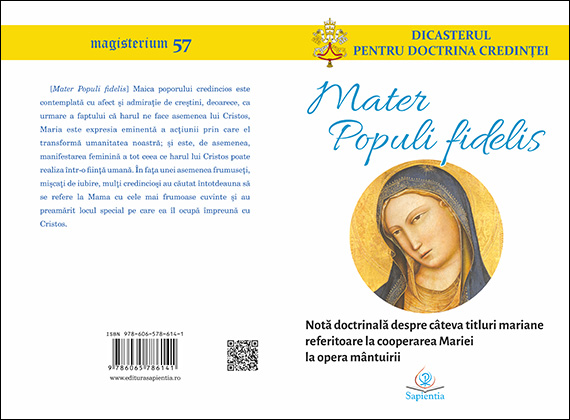 La Editura "Sapientia" a apărut recent cartea: Mater Populi fidelis. Notă doctrinală despre câteva titluri mariane referitoare la cooperarea Mariei la opera mântuirii, scrisă de Dicasterul pentru Doctrina Credinței și tradusă în limba română de pr. dr. Mihai Pătrașcu. Cartea apare în colecția "Magisterium", în formatul 14Ś20, are 70 p. și poate fi procurată de la Librăria "Sapientia" (www.librariasapientia.ro), precum și de la celelalte librării catolice din țară la prețul de 15 lei.
